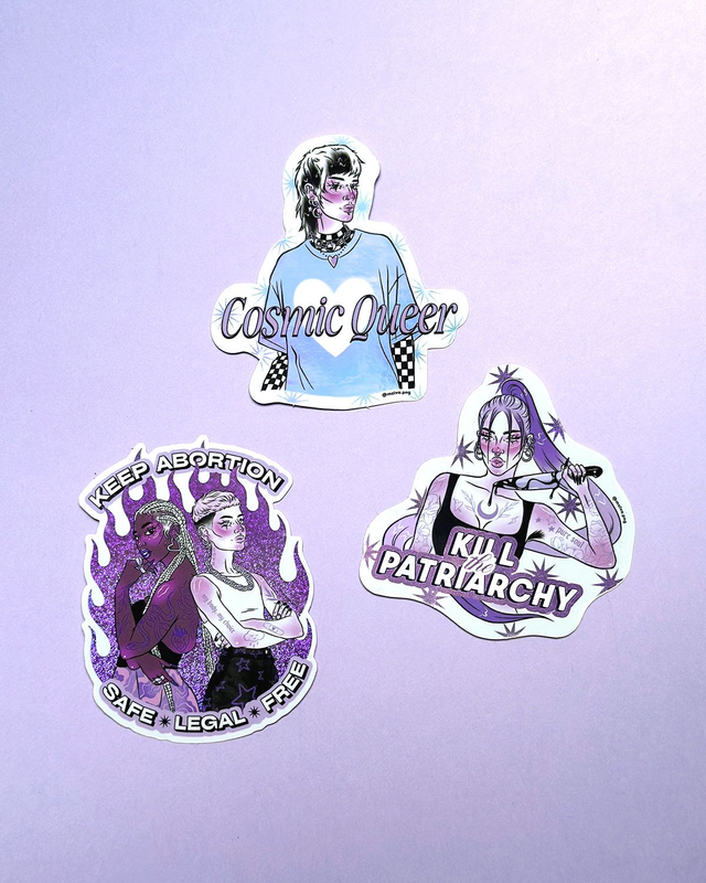 Stickers contenus dans le pack : Cosmic queer, Kill the patriarchy, Keep abortion safe, legal & free.
