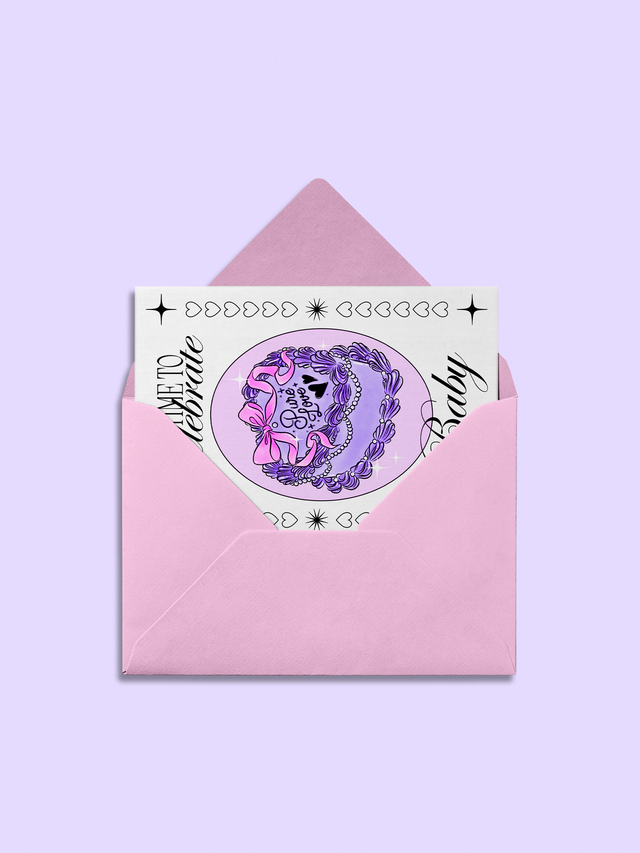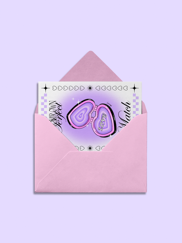 Illustration imprimée sur papier couché mat 189g. Format carte postale (10,5 × 15 cm) avec enveloppe rose pastel. Modèle Perfect Match ou Pure Love au choix.