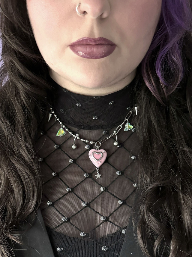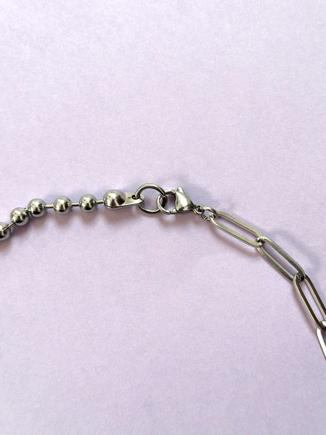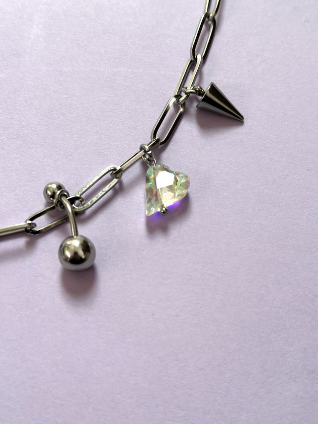 Collier Totem avec pendentif en argile autodurcissante peint à la main aux effets chromés et verni d’une résine UV. Perles de cristal iridescentes et apprêts bijoux en acier inoxydable. Fermoir menottes. Longueur tour de cou : 47 cm, taille du pendentif : 2,5 × 2,5 cm. Vendu avec son pochon en organza violet.